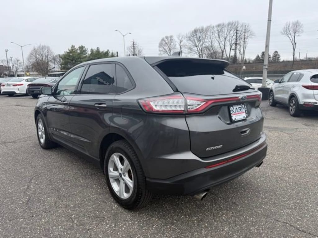 The 2018 Ford Edge SE is the base trim midsize SUV, featuring a 245-hp 2.0L EcoBoost engine, 6-speed automatic transmission, and standard front-wheel drive (AWD optional). Key features include 18-inch wheels, push-button start, a rearview camera, SYNC infotainment with Bluetooth, and a 60/40 split-bench rear seat.