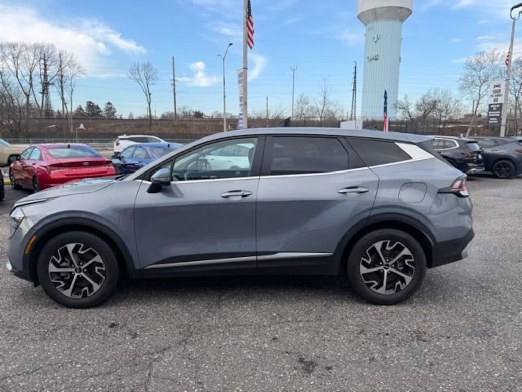The 2023 Kia Sportage EX is a tech-forward trim featuring a 12.3-inch touchscreen with navigation, SynTex synthetic leather seating, heated front seats, a wireless charging pad, and dual-zone automatic climate control. Key safety additions include rear cross-traffic collision-avoidance assist, safe exit warning, and blind-spot monitoring.